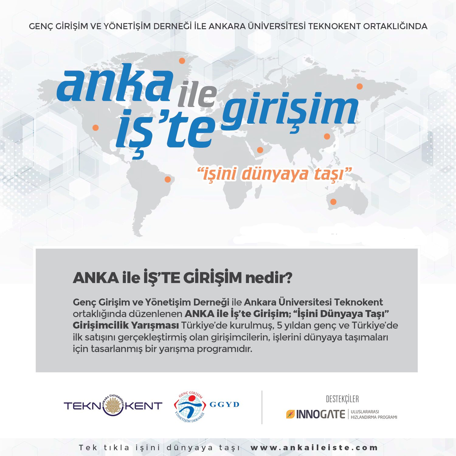 Genç Girişim ve Yönetişim Derneği (GGYD) ve Ankara Üniversitesi Teknokent ortaklığında düzenlenecek olan Anka ile İŞ’te Girişim yarışmasına ait duyuru detayları aşağıda ve ekte yer almaktadır.