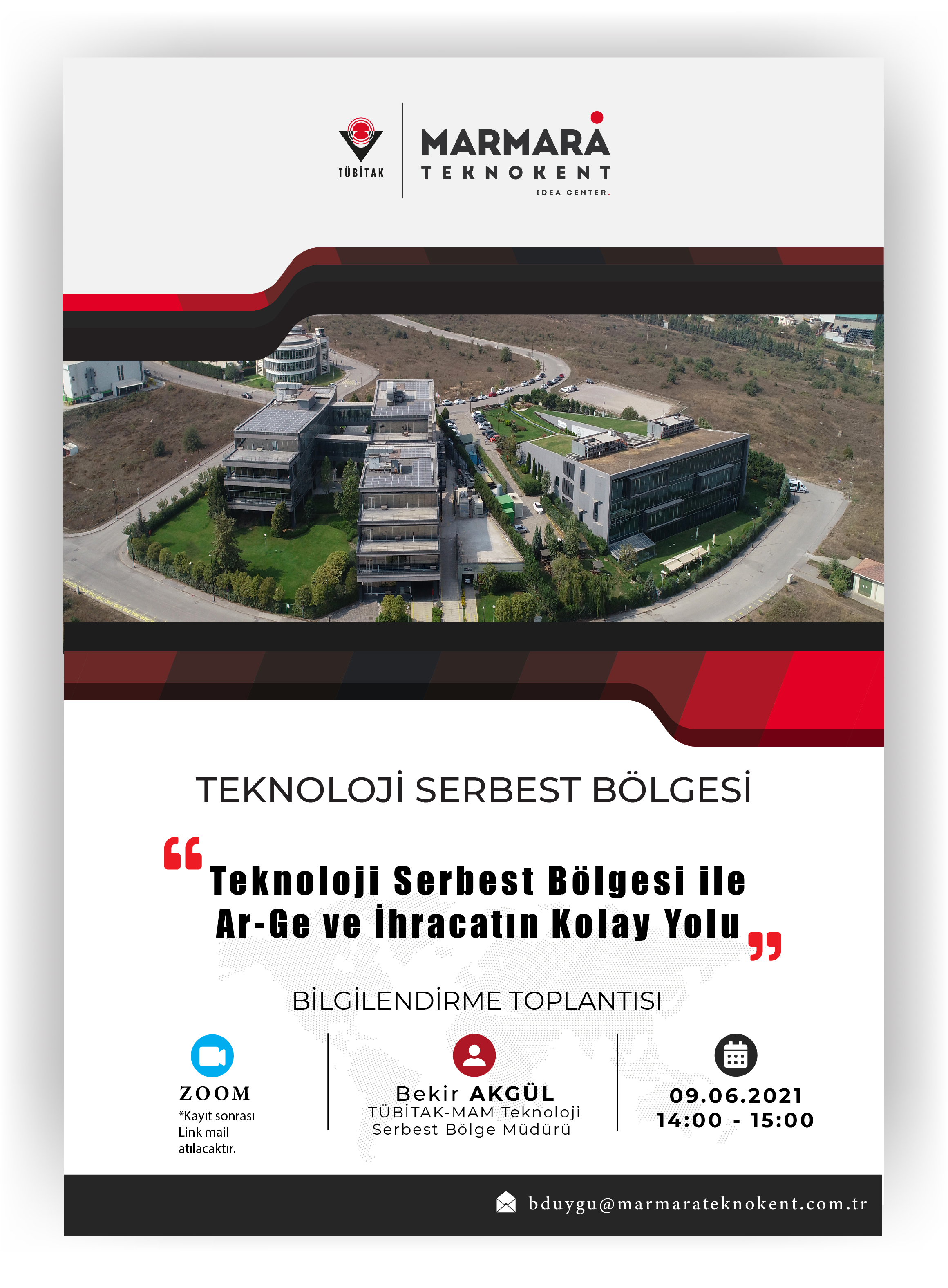 Marmara Teknokent İş Geliştirme ve Proje İzleme Birimi yürütücülüğünde 09 Haziran 2021 tarihi saat 14:00-15:00 arasında TÜBİTAK-MAM Teknoloji Serbest Bölge Müdürü Sayın Bekir AKGÜL tarafından “Teknoloji Serbest Bölgesi ile Ar-Ge ve İhracatın Kolay Yolu ” konulu online bilgilendirme günü düzenlenecektir.
