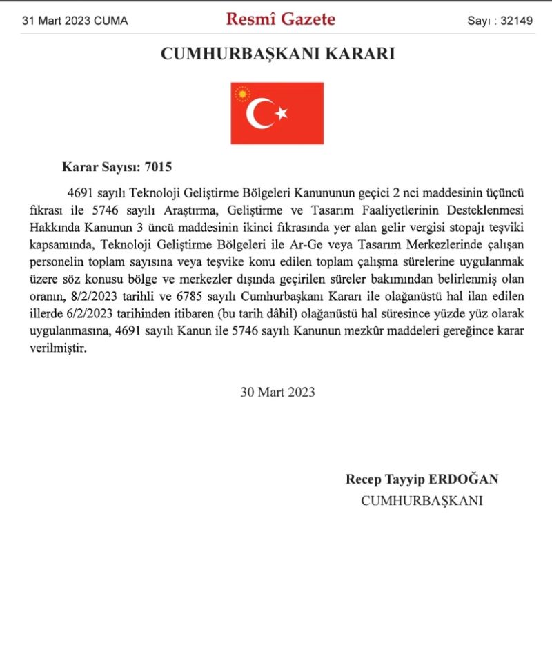 4691 sayılı Teknoloji Geliştirme Bölgeleri Kanununun geçici 2 nci maddesinin üçüncü fıkrası ile 5746 sayılı Araştırma, Geliştirme ve Tasarım Faaliyetlerinin Desteklenmesi Hakkında Kanunun 3 üncü maddesinin ikinci fıkrasında yer alan gelir vergisi stopajı teşviki kapsamında, Teknoloji Geliştirme Bölgeleri ile Ar-Ge veya Tasarım Merkezlerinde çalışan personelin toplam sayısına veya teşvike konu edilen toplam çalışma sürelerine uygulanmak üzere söz konusu bölge ve merkezler dışında geçirilen süreler bakımından belirlenmiş olan oranın, 8/2/2023 tarihli ve 6785 sayılı Cumhurbaşkanı Kararı ile olağanüstü hal ilan edilen illerde 6/2/2023 tarihinden itibaren (bu tarih dâhil) olağanüstü hal süresince yüzde yüz olarak uygulanmasına, 4691 sayılı Kanun ile 5746 sayılı Kanunun mezkûr maddeleri gereğince karar verilmiştir.