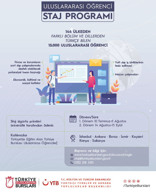 T.C. Kültür ve Turizm Bakanlığı Uluslararası Öğrenciler Daire Başkanlığı tarafından ülkemizde eğitim alan uluslararası öğrencilerin isteğe bağlı staj yapabilmesi hedefi ile “Uluslararası Öğrenci Staj Programı” oluşturulmuştur.