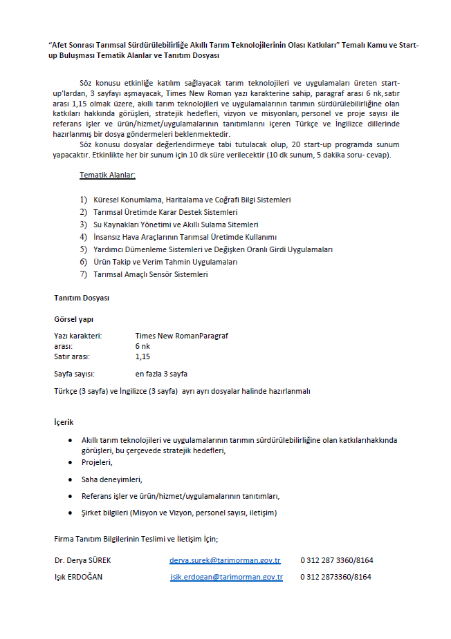 Söz konusu etkinliğe katılım sağlayacak tarım teknolojileri ve uygulamaları üreten start-up’lardan; 3 sayfayı aşmayacak, Times New Roman yazı karakterine sahip, paragraf arası 6 nk, satır arası 1,15 olmak üzere, akıllı tarım teknolojileri ve uygulamalarının tarımın sürdürülebilirliğine olan katkıları hakkında görüşleri, stratejik hedefleri, vizyon ve misyonları, personel ve proje sayısı ile referans işler ve ürün/hizmet/uygulamalarının tanıtımlarını içeren Türkçe ve İngilizce dillerinde hazırlanmış bir dosya göndermeleri beklenmektedir.
