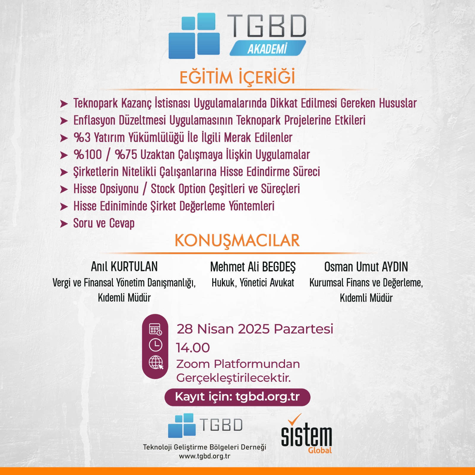 Teknoloji Geliştirme Bölgeleri Derneği ve Sistem Global Danışmanlık iş birliğinde TGBD Akademi Programımız kapsamında düzenleyeceğimiz eğitimimize davetlisiniz!