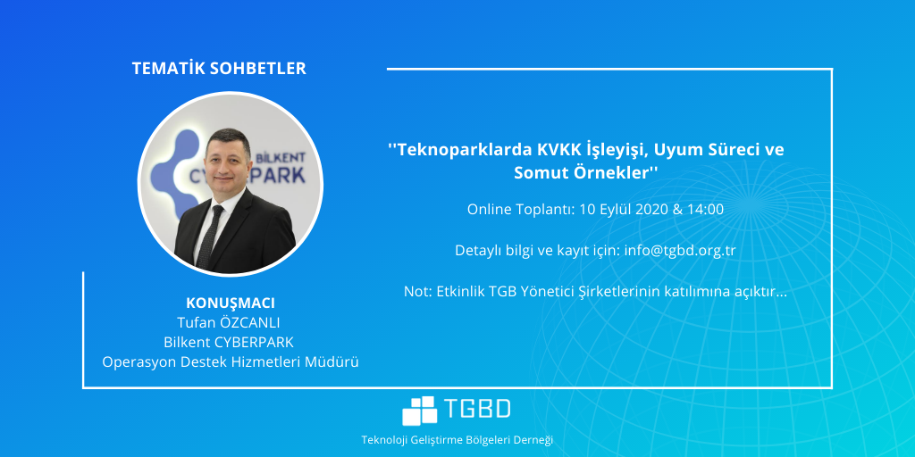 İkinci toplantıda ise; Bilkent CYBERPARK Operasyon Destek Hizmetleri Müdürü Tufan ÖZCANLI, teknoparklarda KVKK işleyişini somut örneklerle anlatarak bilgi verecektir.