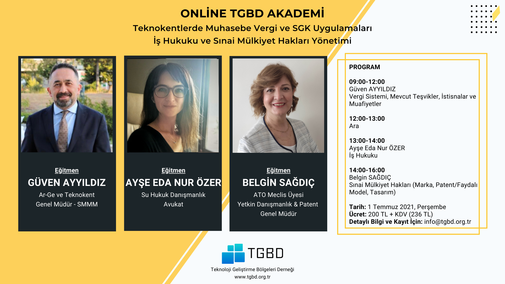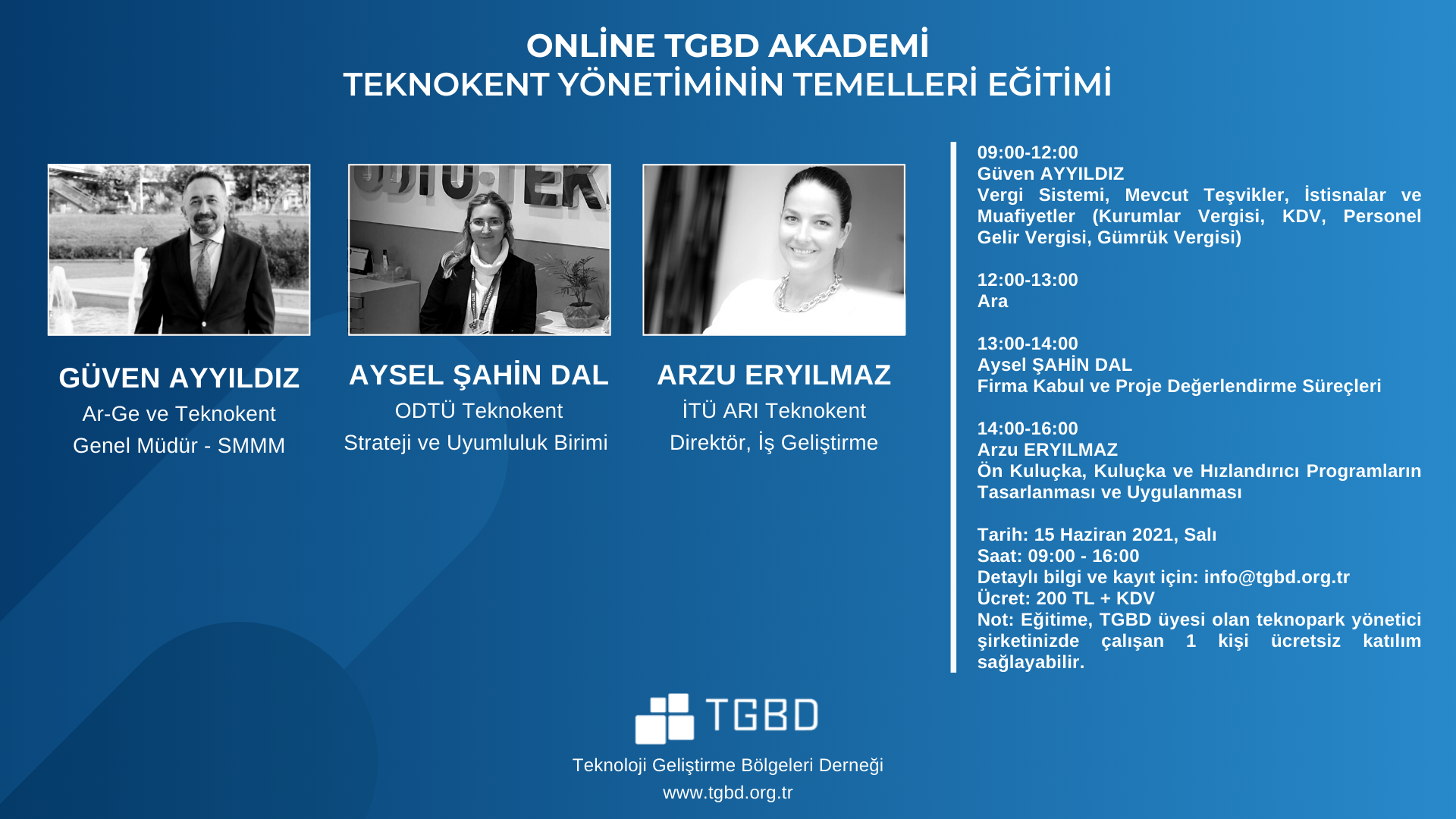 Derneğimizin başlıca amaçlarından biri olan Türkiye’deki Teknoparkların gelişimine yönelik eğitimlerin düzenlenmesi kapsamında “TGBD Akademi Programı’’ 2015 yılında başlatılmıştır.